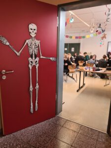 Wir trafen uns alle zur ersten Stunde in unseren Klassenräumen, wo wir erst einmal eine kurze Belehrung für den Tag durchführten. Danach wurde uns der Ablaufplan erklärt und wir bekamen eine Art Aufgabenbuch in Form eines Totenkopfs. In diesem Buch standen Aufgaben, die wir bis zum Ende des Schultages lösen bzw. bearbeiten sollten. Da wir den Großteil des Tages Stationsarbeit machten, bereiteten wir die Stationen in unseren Klassenräumen vor.
