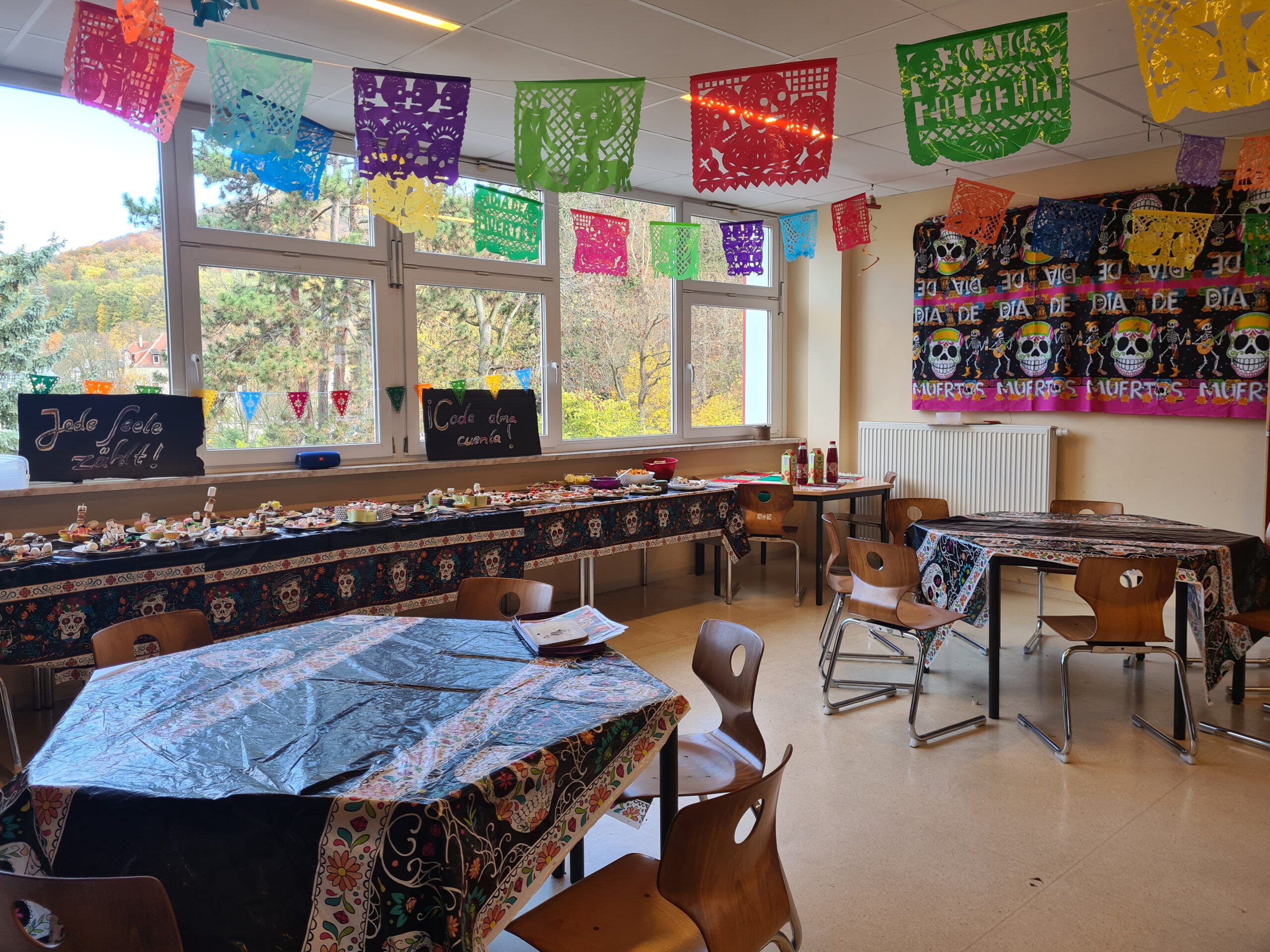 Am Donnerstag, den 30.10.2025, veranstaltete unsere Schule den alljährigen Fremdsprachentag für die siebten Klassen. Die beiden Spanisch-Klassen 7/4 und 7/5 ,,feierten“ zusammen mit den Spanischlehrern den ,,Día de los muertos“ (Tag der Toten), einen mexikanischen Feiertag, der vom 31.10. bis zum 02.11. gefeiert wird.